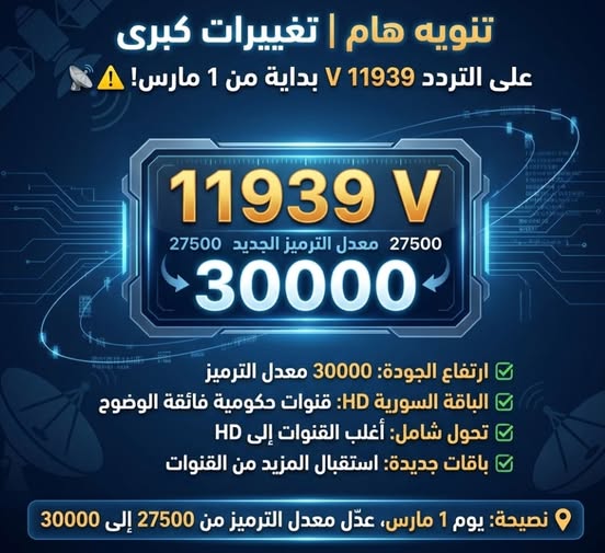 تنويه هام لمتابعي قنوات النايل سات ابتداءً من 1 مارس القادم هيتم إجراء تغييرات كبرى على التردد: 📍 11939 عمودي (V) وسيتم تغيير معدل الترميز من 🔄 27500 إلى 30000 ⚡ 🎯 ماذا يعني هذا التغيير؟ ✅ جودة أعلى واستقرار أقوى رفع معدل الترميز إلى 30000 يسمح ببث بيانات أكبر، وده معناه صورة أوضح وثبات أفضل في الإشارة 📺✨ ✅ انضمام الباقة السورية الحكومية HD بالكامل التردد هيضم القنوات السورية بجودة فائقة الوضوح 🔥 ✅ تحول شامل إلى HD أغلب القنوات الموجودة حالياً على التردد هتتحول رسميًا لجودة عالية الوضوح 🎬 ✅ إمكانية إضافة باقات جديدة زيادة السعة تفتح المجال لدخول قنوات جديدة خلال الفترة المقبلة 📡 ⚠️ مهم جداً لو يوم 1 مارس لاحظت إن القنوات فصلت عندك ✔️ ادخل على إعدادات الرسيفر ✔️ عدل معدل الترميز من 27500 إلى 30000 ✔️ احفظ التعديل وهتشتغل القنوات بأفضل جودة بإذن الله https://k.top4top.io/p_3698nlo751.jpg |